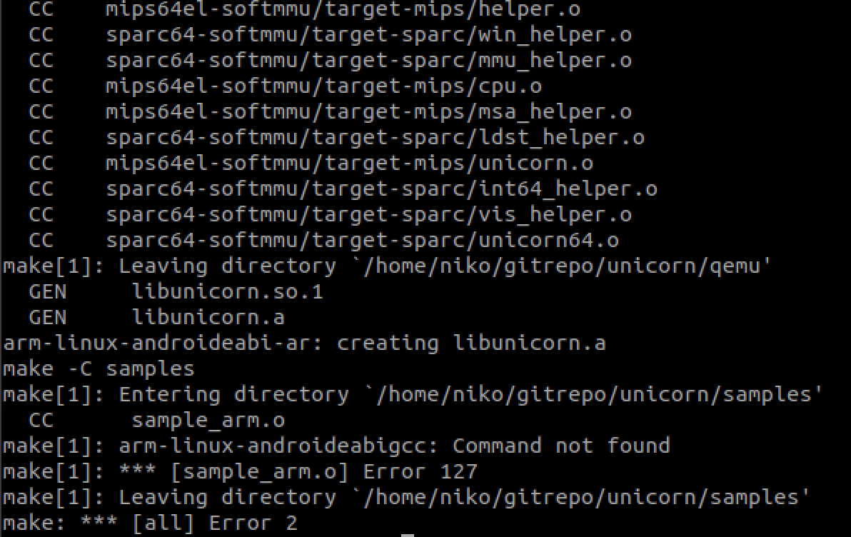 接着将工具链中的bin目录加入到PATH环境变量中,此时的bin目录中已经包含了arm-linux-androideabi-gcc。 再次运行,发现此时已经能够正常编译出 libunicorn.so 和 libunicorn.a 文件了, 但是samples 目录的编译仍然失败了,